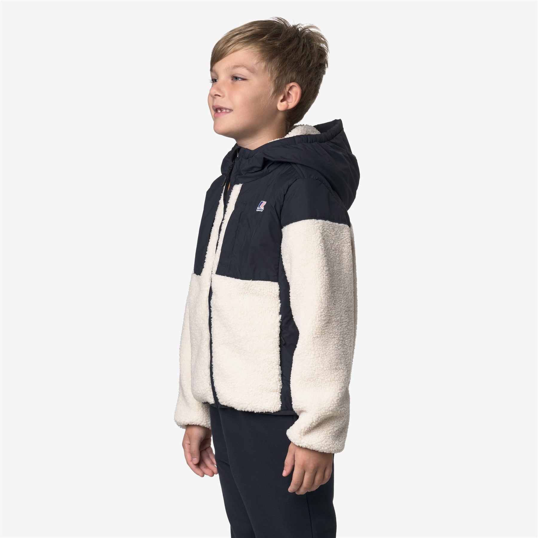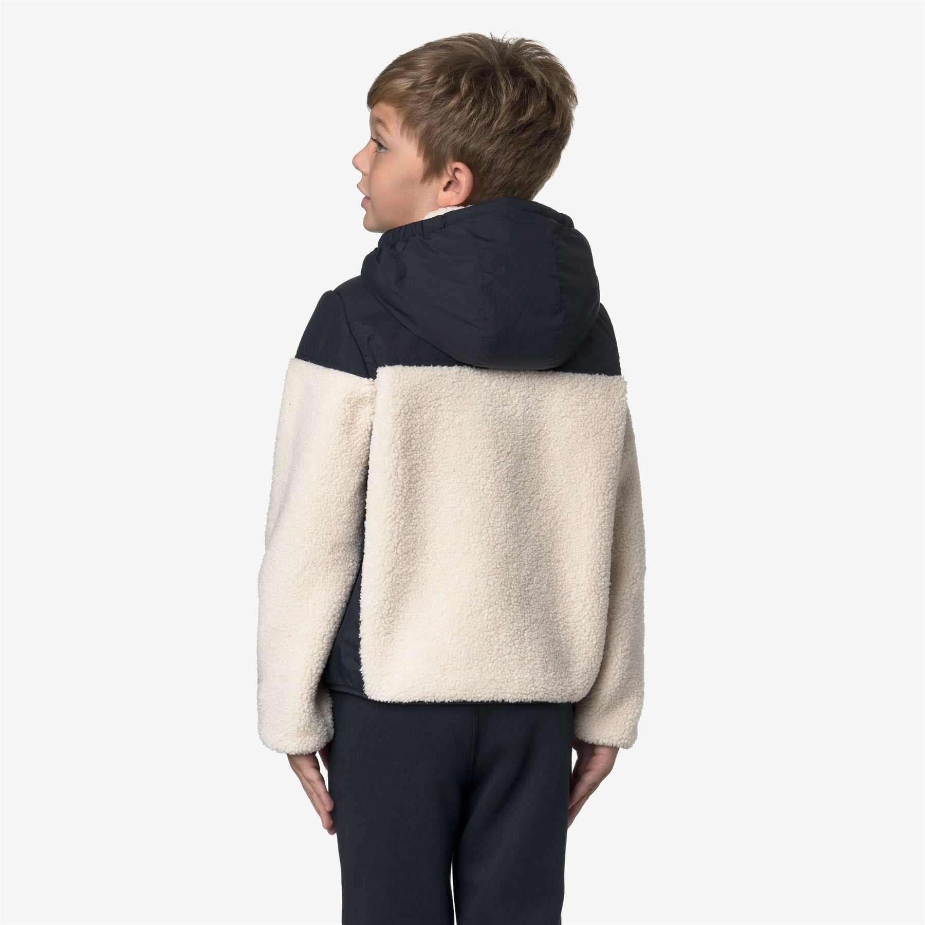 Samson est une veste courte pour enfants conçue pour les intempéries et les premiers froids. Fabriquée en tissu chaud et doux effet sherpa avec des inserts en nylon recyclé 100% micro ripstop imperméables et respirants, elle offre confort, protection et style fonctionnel.